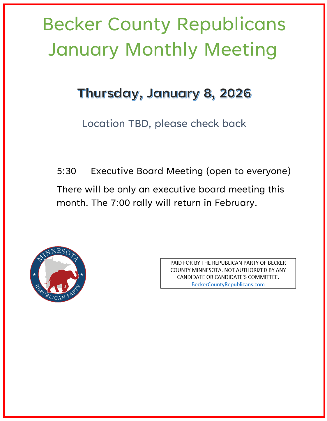 We are a group of like-minded patriots from Becker County, Minnesota, who believe in the principles of liberty. The next regular monthly meeting will be Thursday, February 12, 2026. Please join us at the VFW Post 1676 at 500 North Washington Avenue in Detroit Lakes starting at 7:00 pm. Come early if you would like to purchase some appetizers or beverages. For more information, call (218) 234-2292 or email Chair@BeckerCountyRepublicans.com.