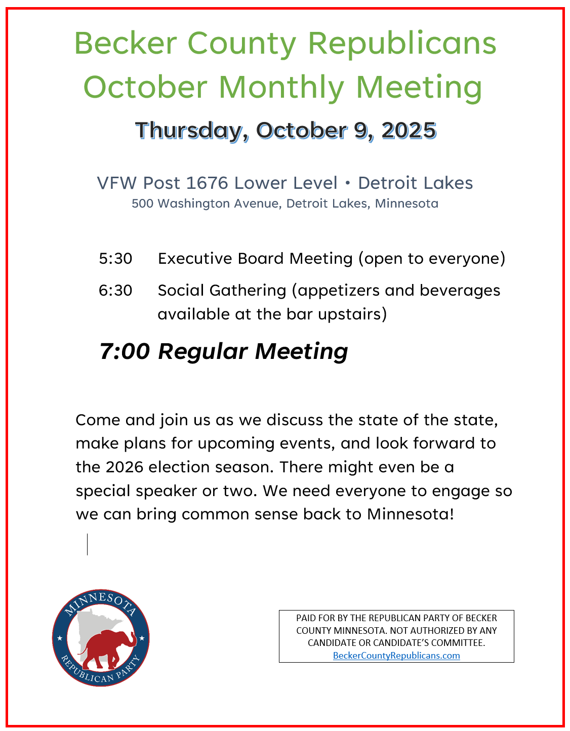 We are a group of like-minded patriots from Becker County, Minnesota, who believe in the principles of liberty. The next regular monthly meeting will be Thursday, October 9, 2025. Please join us at the VFW Post 1676 at 500 North Washington Avenue in Detroit Lakes starting at 7:00 pm. Come early if you would like to purchase some appetizers or beverages. For more information, call (218) 234-2292 or email Chair@BeckerCountyRepublicans.com.