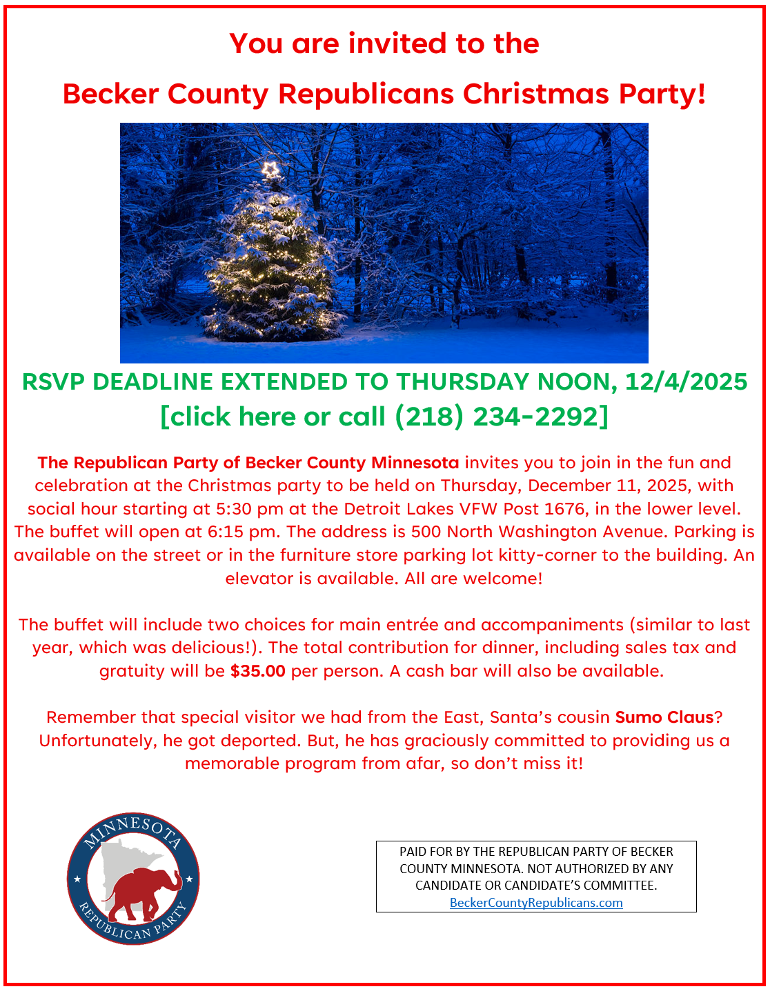 We are a group of like-minded patriots from Becker County, Minnesota, who believe in the principles of liberty. The next regular monthly meeting will be Thursday, January 8, 2026. Please join us at the VFW Post 1676 at 500 North Washington Avenue in Detroit Lakes starting at 7:00 pm. Come early if you would like to purchase some appetizers or beverages. For more information, call (218) 234-2292 or email Chair@BeckerCountyRepublicans.com.