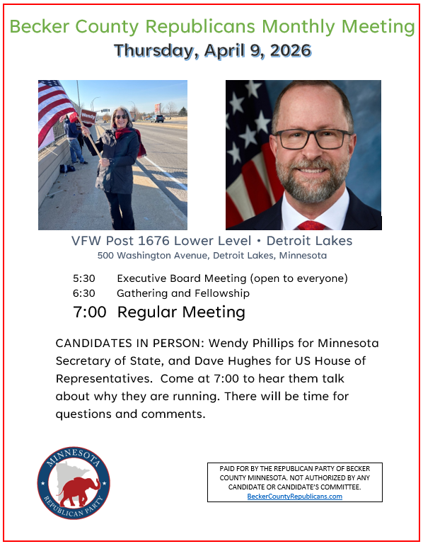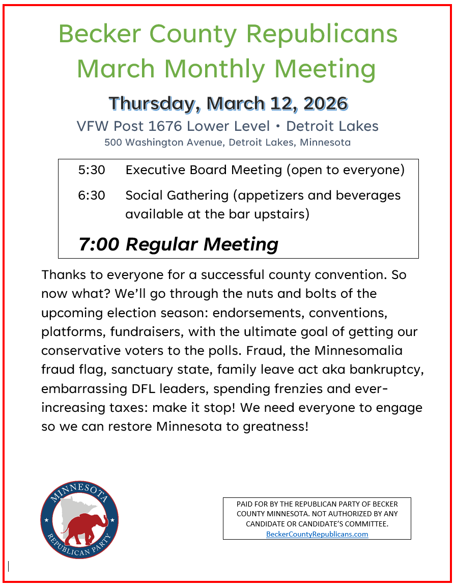 For more information, call (218) 234-2292 or email Chair@BeckerCountyRepublicans.com.