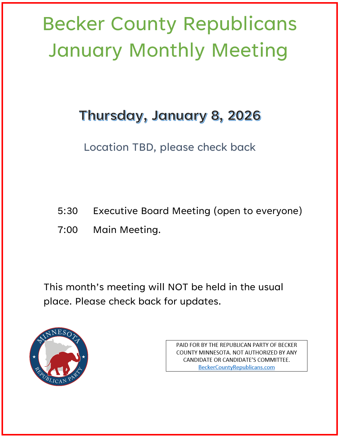 We are a group of like-minded patriots from Becker County, Minnesota, who believe in the principles of liberty. The next regular monthly meeting will be Thursday, February 12, 2026. Please join us at the VFW Post 1676 at 500 North Washington Avenue in Detroit Lakes starting at 7:00 pm. Come early if you would like to purchase some appetizers or beverages. For more information, call (218) 234-2292 or email Chair@BeckerCountyRepublicans.com.